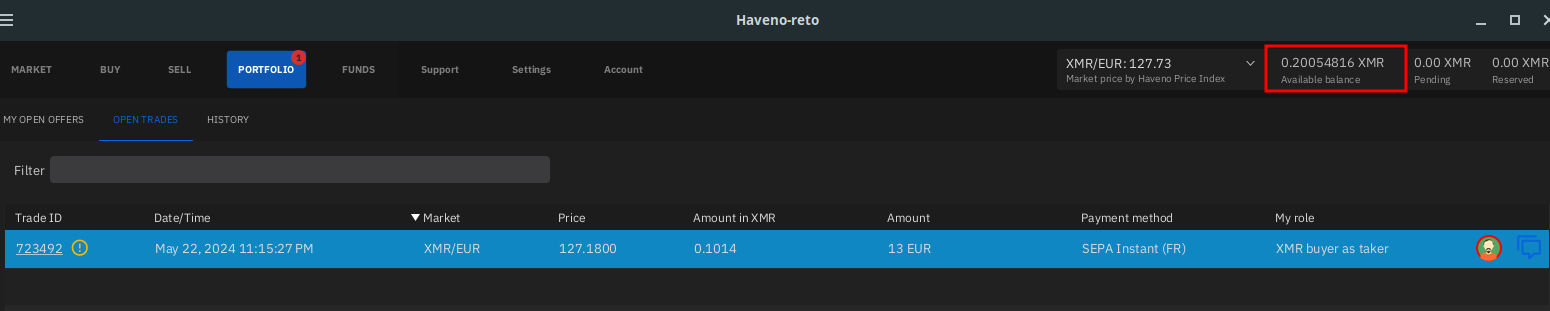 Et enfin, Bob reçoit son Monero sans aucun problème (il doit attendre 20 minutes pour que le Monero soit dépensable depuis son portefeuille Monero Haveno) :