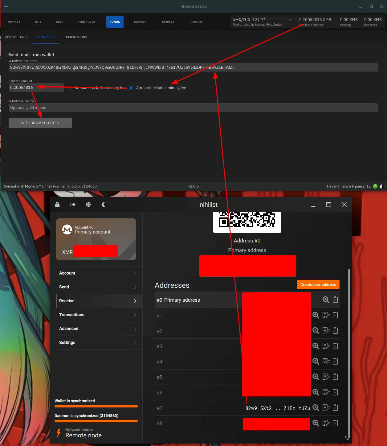 Et ensuite il peut aussi retirer son Monero de son Haveno DEX vers son autre portefeuille Monero comme ceci :