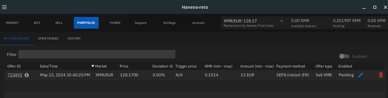 Alice utilise son portefeuille Monero pour financer l'offre, et ensuite cela apparaît comme en attente sur son Haveno DEX :